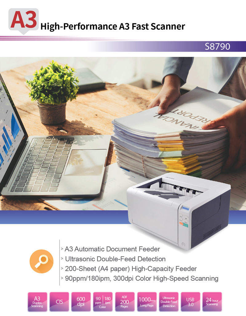 Under a fast scan performance of 90 ppm / 180 ipm, output images of the S8790 are still clear and distinct. With designs of low-noise and tidy paper-output, you are able to enjoy a quiet and orderly work environment.