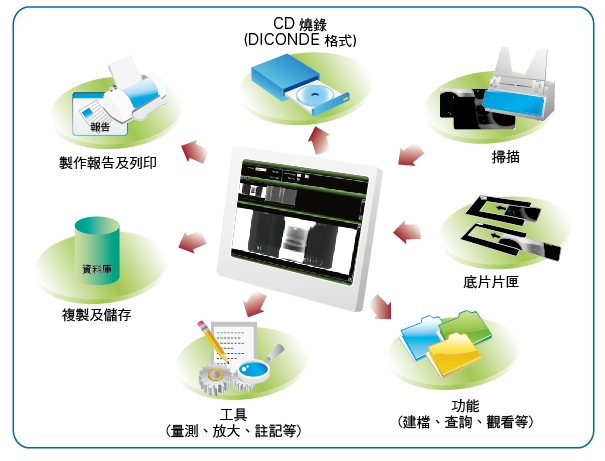 功能強大影像管理軟體,包含建檔、查詢、量測、註記、放大關注區、報告製作、儲存、燒錄等功能,檔案符合DICONDE 標準