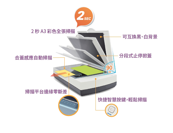 掃描平台邊緣零斷差設計,可確保掃描平台絕對平整,因此合上掃描器上蓋,超大稿件也不會留下任何壓痕。而且,您可以輕鬆地將稿件從平台上輕滑取出,增加操作的方便性;也可以讓書籍易於平貼於玻璃面上,減少書籍內側邊緣影像模糊的問題。